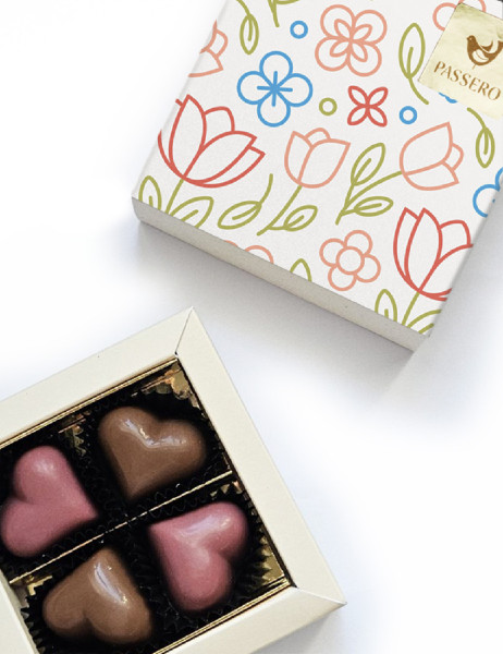 Par izbranih pralinejev: mlečna čokolada z lešnikom in karamelo ter rubin čokolada z malino in vanilijo. Najslajši so, ko jih podarimo iz srca.