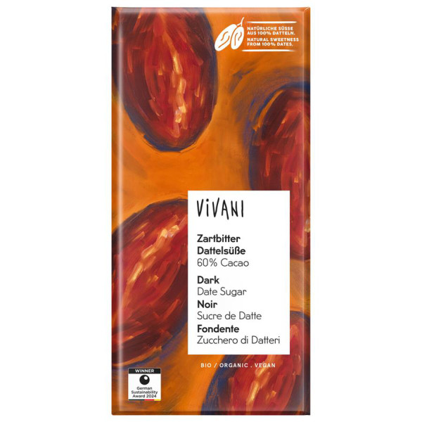 60 % kakava. Vegansko. Naravna sladkost iz 100 % datljev.