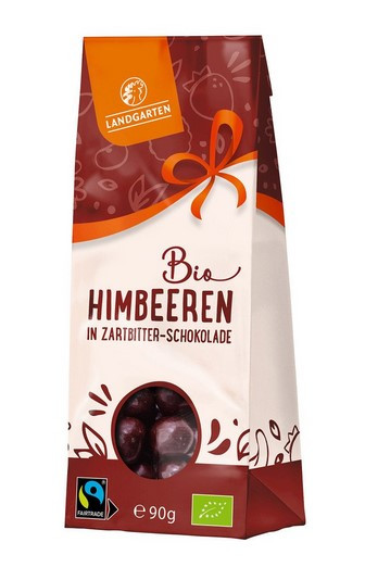 Maline Landgarten v temni čokoladi, ekološko pridelane v EU/FLO Fairtrade. Vegansko in brez glutena.