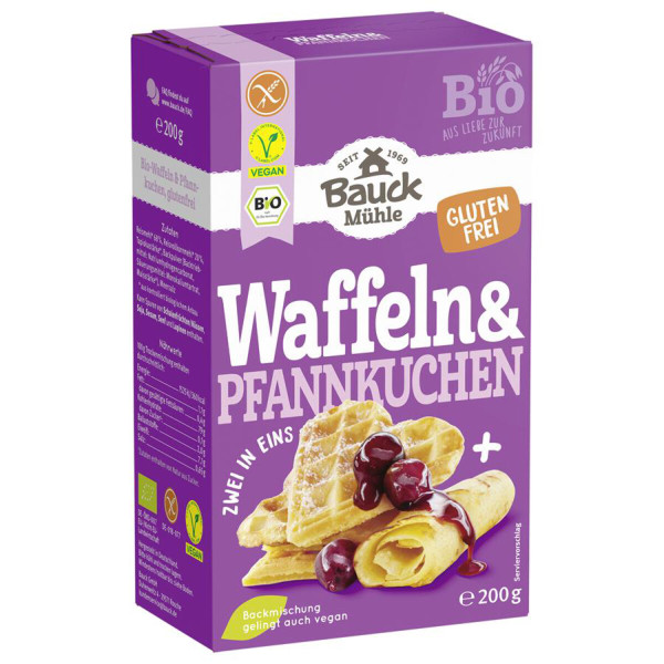 Bio pripravek za vaflje ali palačinke brez jajc in glutena, na osnovi riževe in tapiokine moke.