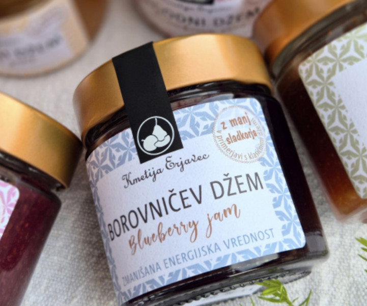 Borovničev džem iz kmetije Erjavec. 62 % sadni delež. Iz slovenskih borovnic. Z manj sladkorja.