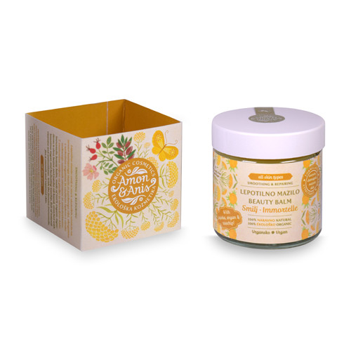 Ekološko Lepotilno mazilo Smilj iz 100% ekoloških sestavin na osnovi karitejevega masla in jojobinega olja, obogateno z razkošnim arganom in vlažilnim šipkom z visoko vsebnostjo naravnih vitaminov in antioksidantov. Z znamenitim smiljem za gladko in obnovljeno kožo.